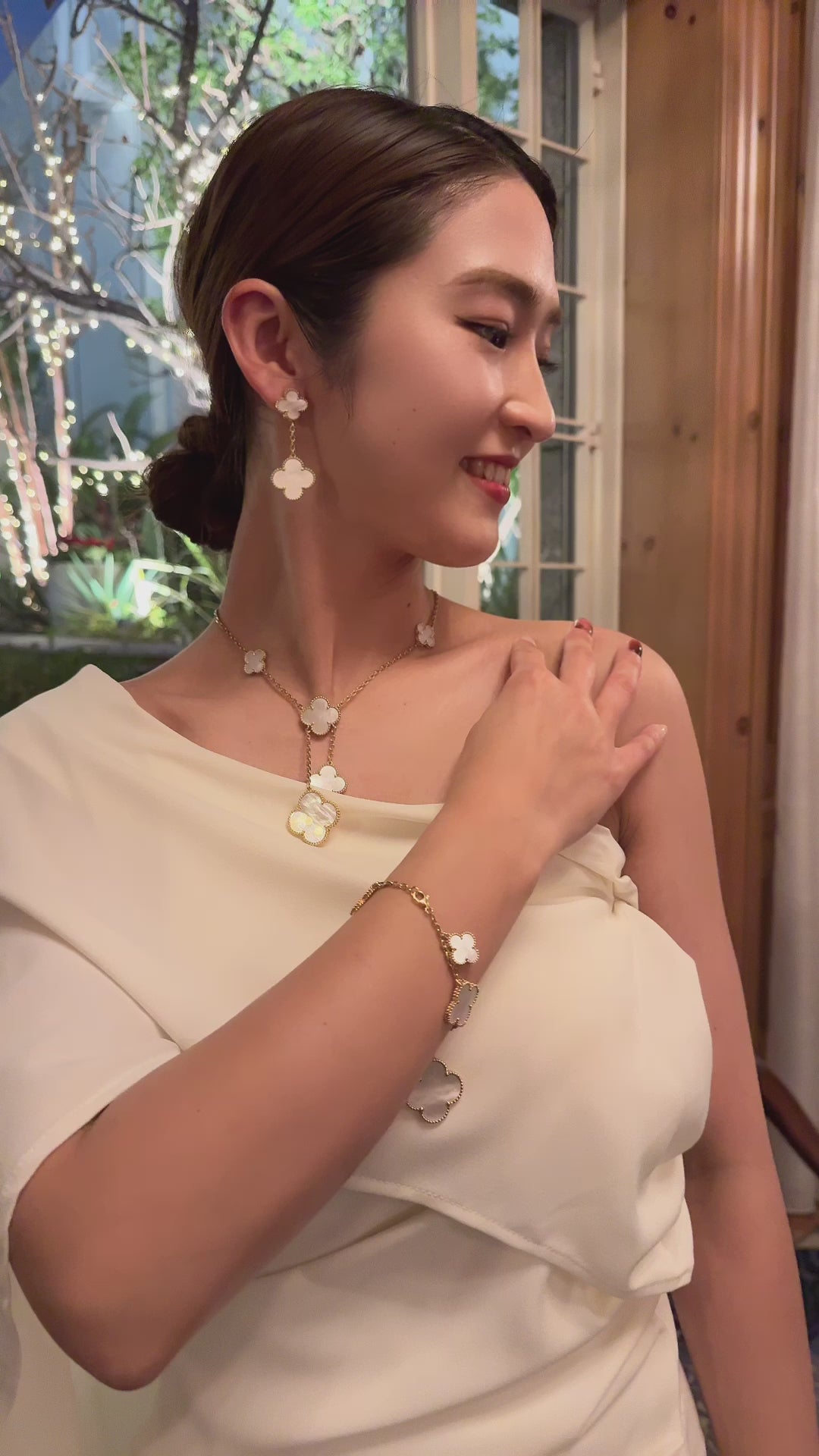 ③マジック アルハンブラ イヤリング、2モチーフ、18K イエローゴールド、ホワイト マザーオブパール